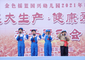 开幕式上,由国兴教师团队表演的腰鼓舞拉开运动会的帷幕。国旗方阵、园旗方阵、农民方阵、工人方阵、军人方阵分别从从主席台依次到指定位置,举行升旗仪式。园长、家长代表、小小运动员分别致辞,表达对运动会的祝福和期盼。在集体热身舞军民大会操后,进入运动会的主要环节——大生产运动。该活动分大生产(耕田、背肥料、抬水、插秧苗)和大丰收(打谷机、板车、抬箩筐)两个部分。整个活动中,工农兵配合默契,一张张纯真的笑脸在阳光下绽放;大小运动员笑声不断,加油声、呐喊声沸腾了整个运动会场, 他们自信而又快乐的神情,运动会现场洋溢着家庭的温馨与趣味的欢笑!